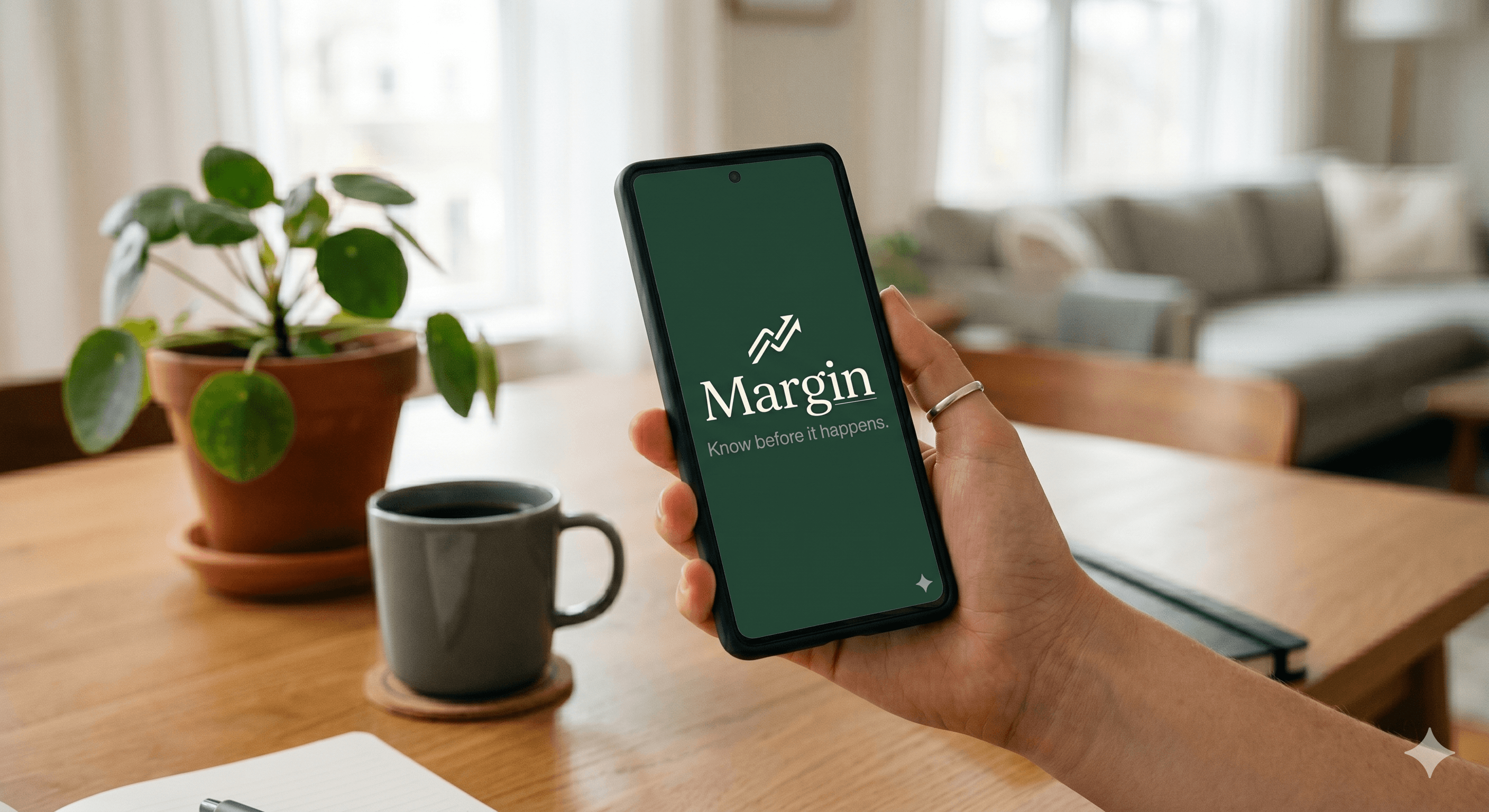 The result is Margin — an app that predicts financial stress before it hits you. Not a budgeting tracker. Not another dashboard full of charts. It watches your balance, your upcoming bills, your patterns — and tells you "if you book this trip today, you'll fall below rent money in 18 days."