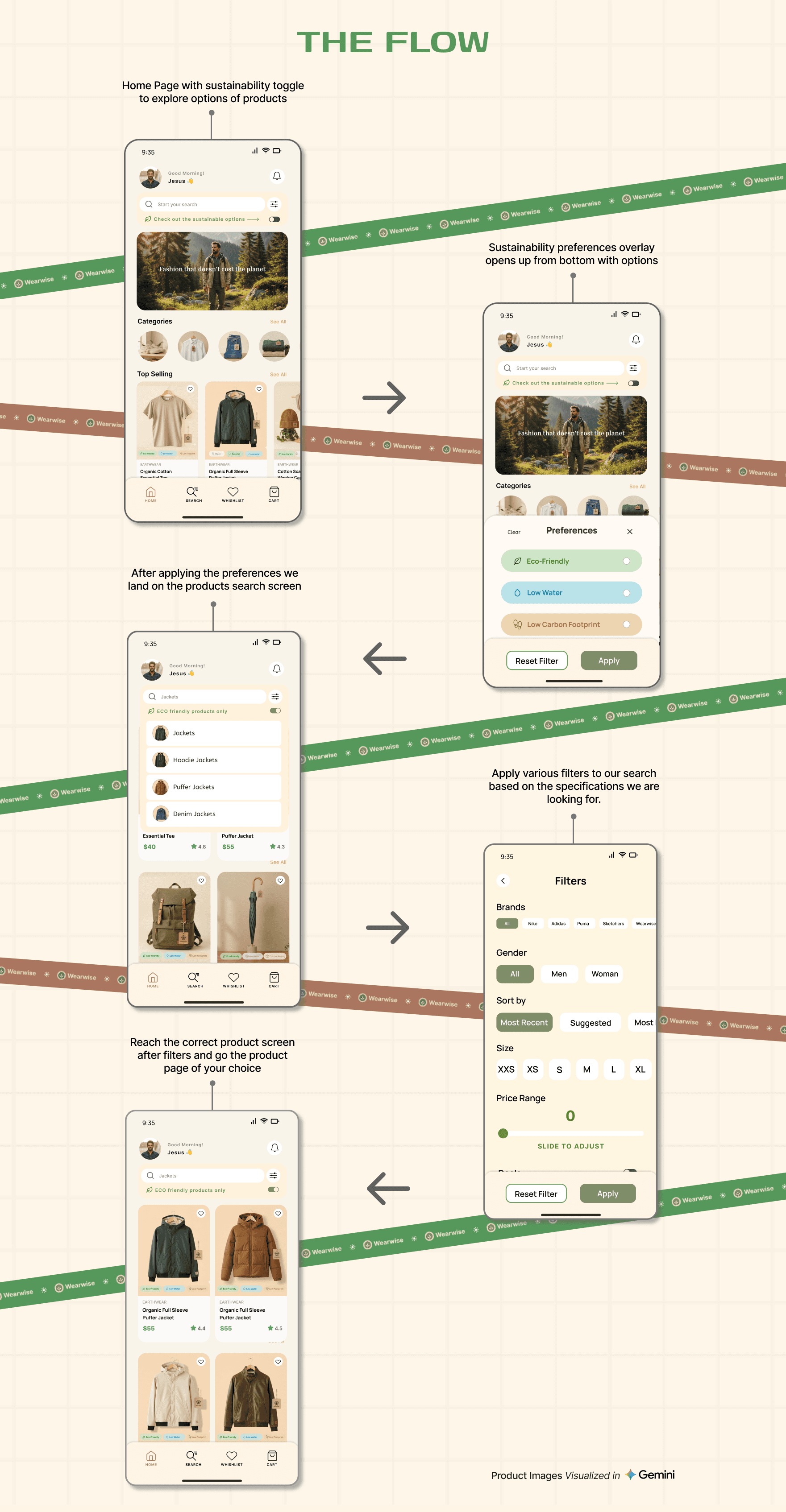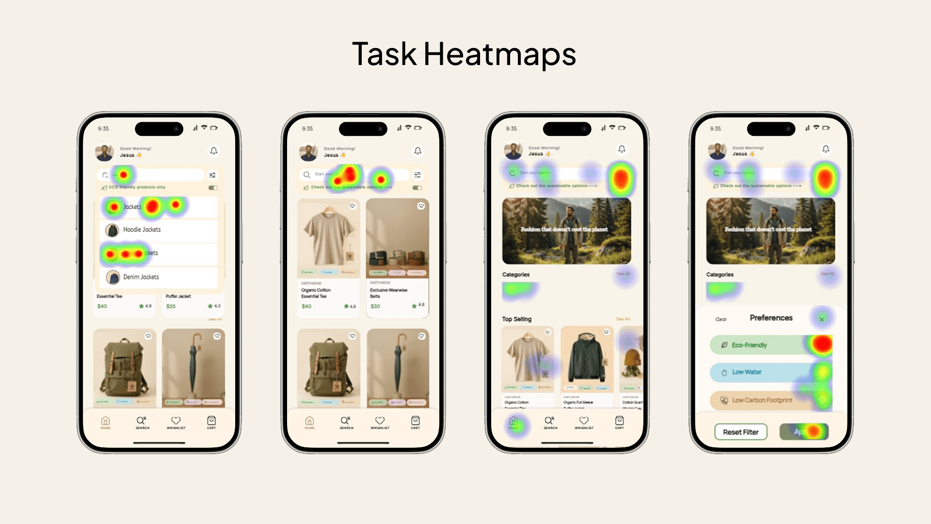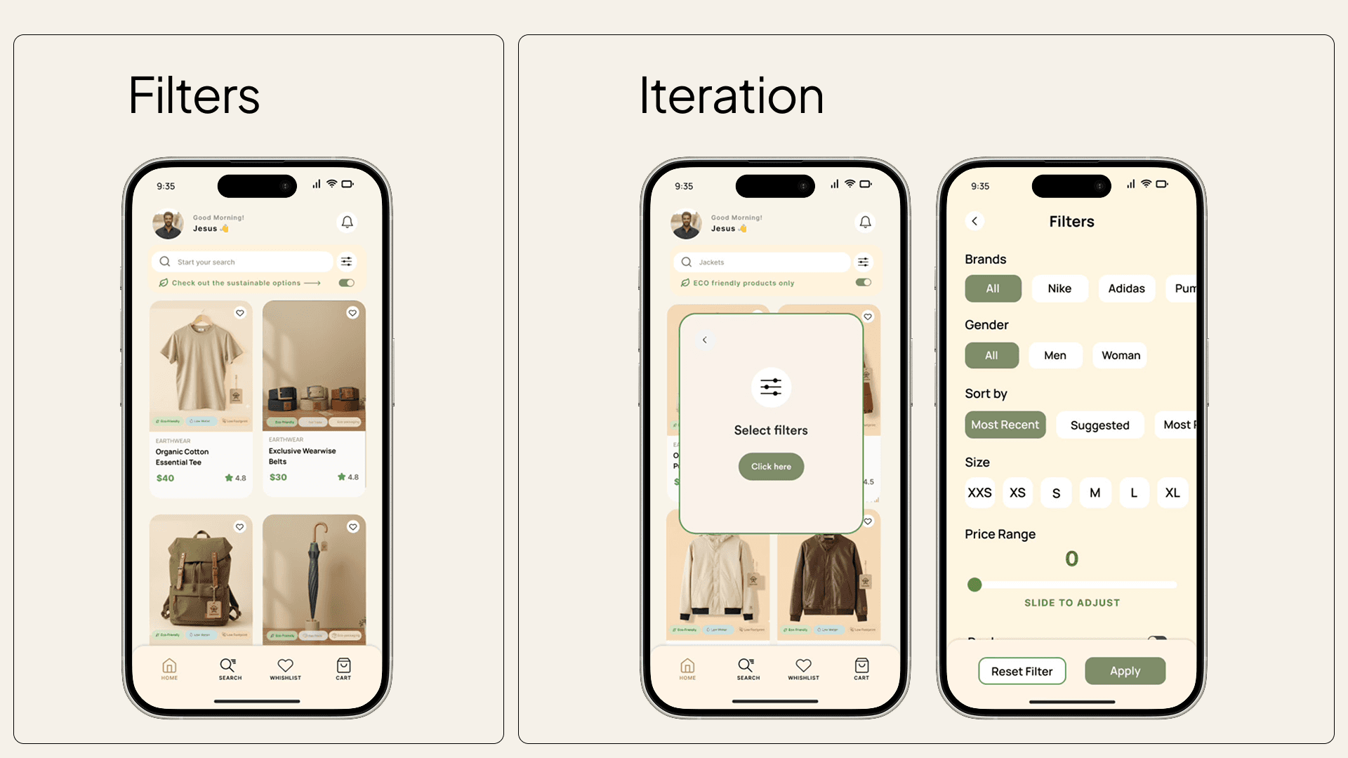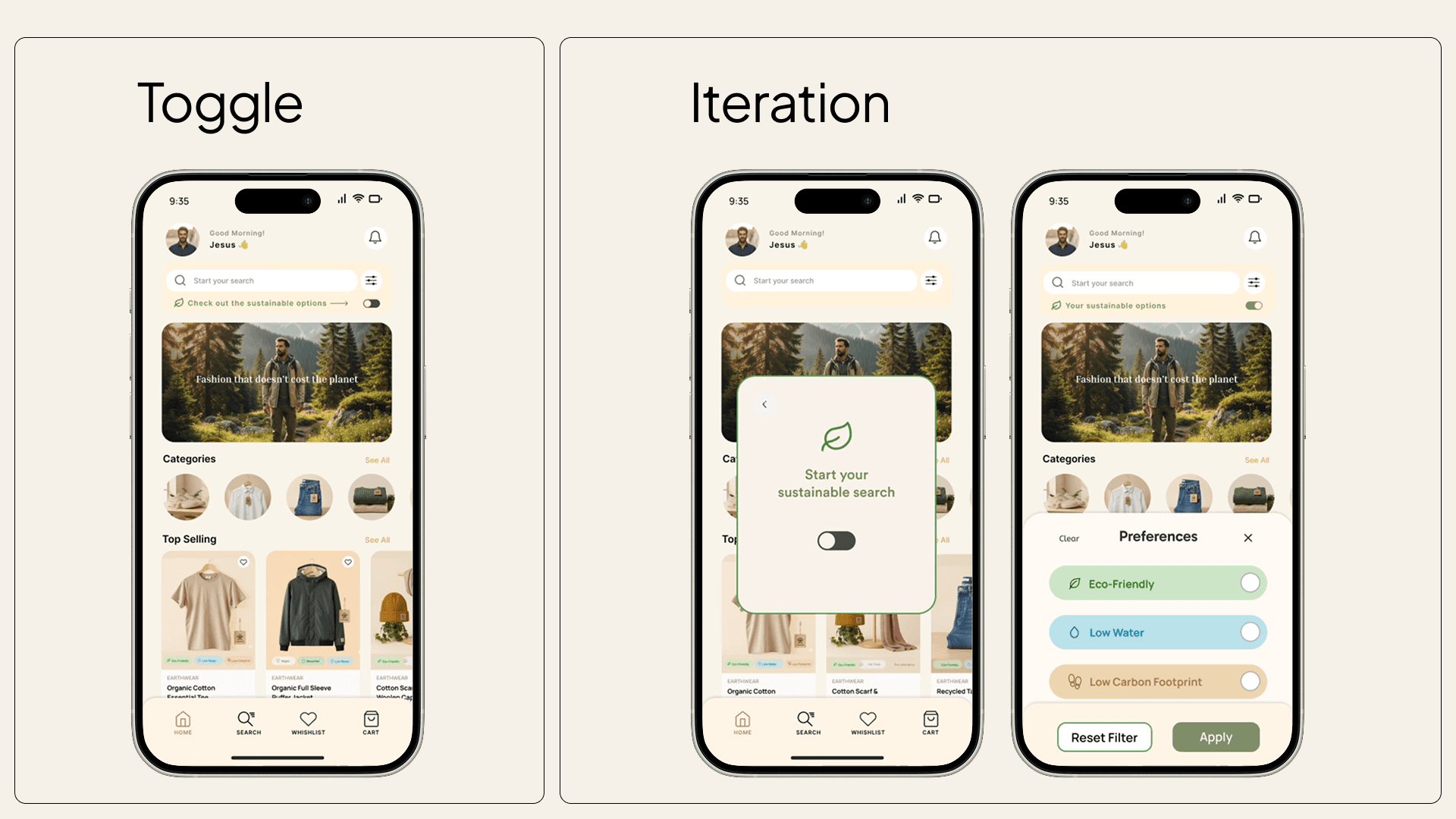 A sustainability toggle was placed directly below search, opening a simple overlay where users could select preferences like eco-friendly materials, low water usage, or low carbon footprint.