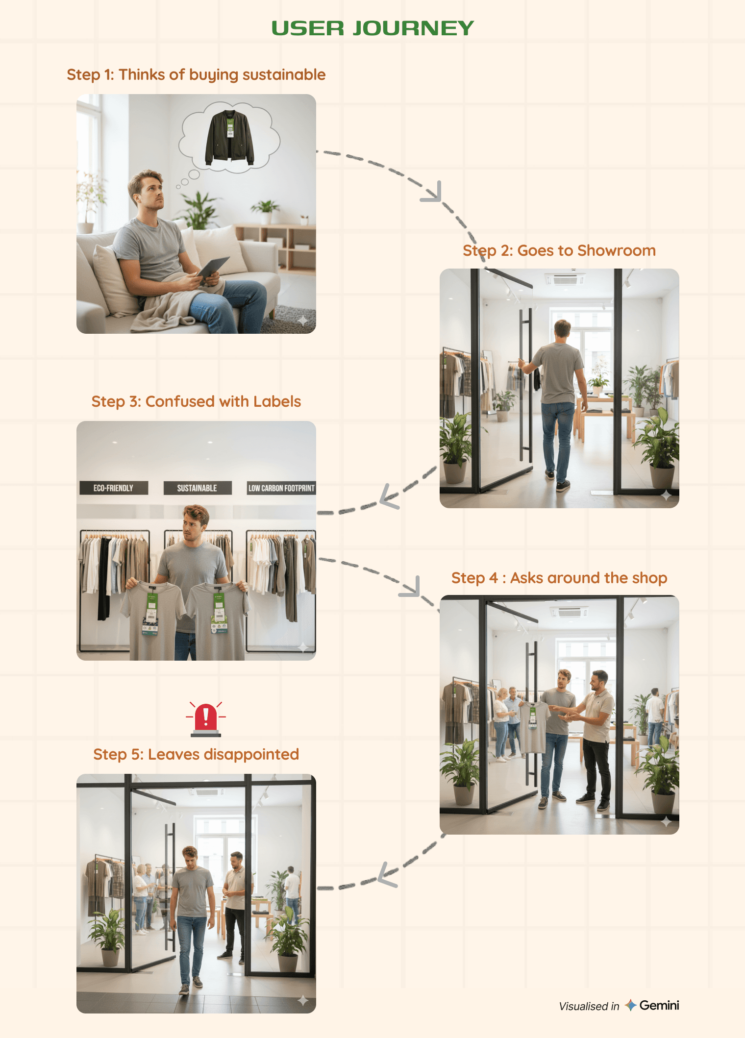 Mapping the journey showed a clear breakdown point. Users entered with good intent, tried to interpret sustainability labels, began comparing without context, and slowly lost certainty.